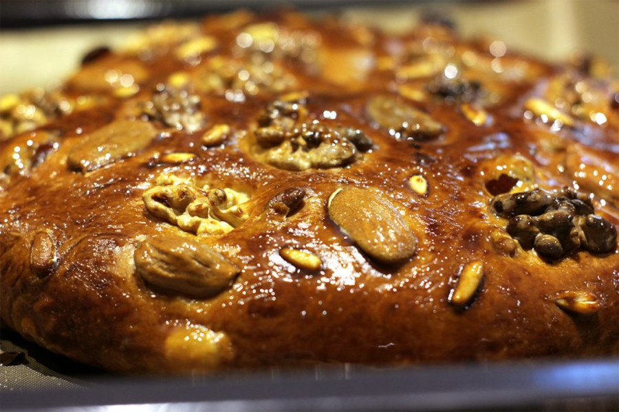 - Si decora! Disponi la frutta secca sulla parte superiore della torta e spennellala poi con il tuorlo d’uovo sbattuto insieme al latte. Lascia nuovamente riposare per 2 ore e mezza.