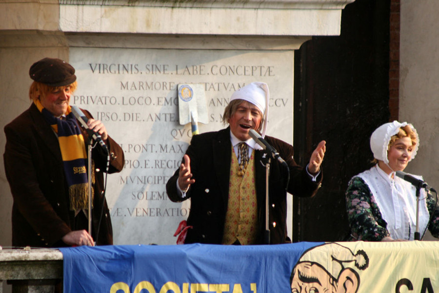 La tradizione dell’arrivo della famiglia di Sandrone alla stazione di Modena, però, continua ancora oggi con una sfilata che li porta fino a Piazza Grande. Qui i 3 personaggi tengono il tradizionale sproloquio dal balcone del Palazzo Comunale: una critica satirica all’amministrazione comunale, in dialetto modenese.